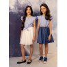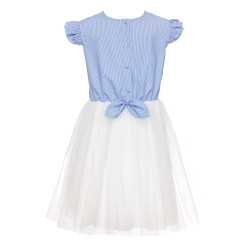 Beautiful Confirmation dress. Made of soft tulle and cotton fabric in blue stripes. On the waist line decorated with a bow. The length of the dress reaching the knees.